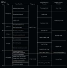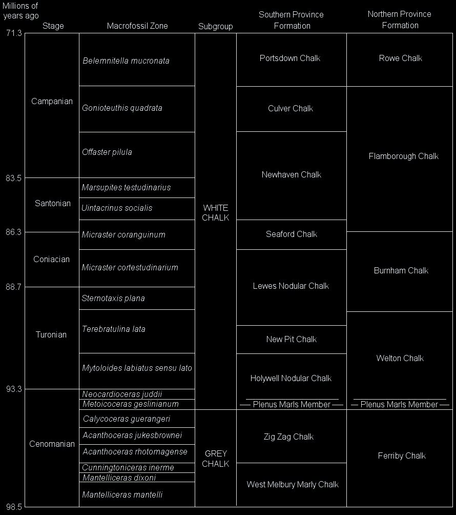 The table below is a review of the Chalk Group lithostratigraphy and biostratigraphy in the context of Late Cretaceous chronostratigraphy.