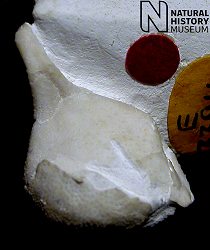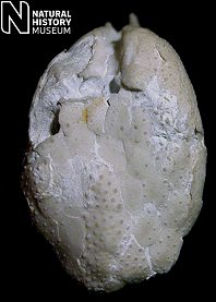 1). Hagenowia anterior; two tests viewed laterally (from the side) with the anterior (front) to the left. H. anterior is defined by its elongate and forward sloping rostrum (both x3.6, Lower Flamborough Chalk, Upper Micraster coranguinum zone, South Landing, Flamborough Head, Yorkshire, BMNH (British Museum (Natural History) London) EE6776. Images © 2005 The Natural History Museum, by kind permission.