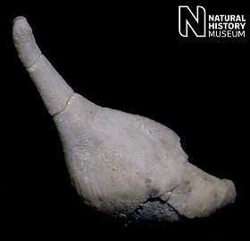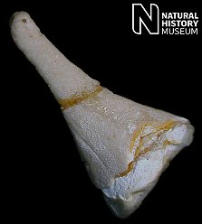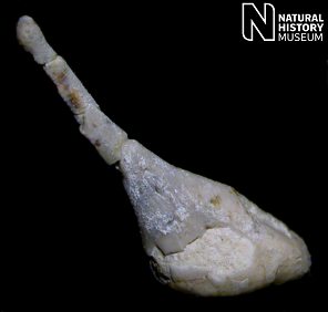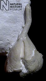 3). Hagenowia rostrata; (A) Side view of test lacking rostrum, x3.0; (B) Underside, x3.2; (C) Side view of a rostrum, x3.2. This form from the Late Coniacian and santonian is distinguished by its robust and relatively short rostrum, often very forward inclined. (A)(B), North Foreland, near Broadstairs, Kent, Gale Collection, BMNH (British Museum (Natural History) London) E76848; (C) Dixon Collection, BMNH 30826. Images © 2005 The Natural History Museum, by kind permission.