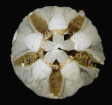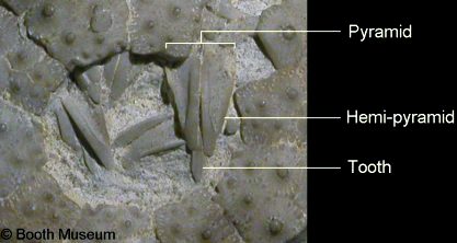 5). Adoral view of a partially decayed recent cidaroid (x5). The peristome is a flexible plated surface which contains the mouth-opening. The complex jaw apparatus (the 'Aristotle's Lantern') (BMNH guide) protrudes through the mouth opening, allowing the cidaroid to feed on material which it passes over. Many different elements make up the lantern, the most recognisable being the ten beak-like hemi-pyramids.