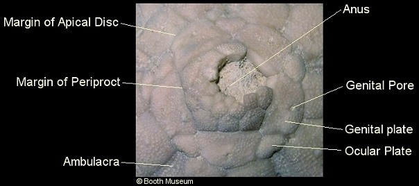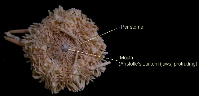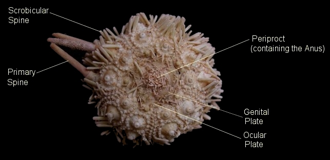 The anatomy and morphology of regular echinoids is strongly influenced by their mode of life (BMNH guide). Their diet is based around material scavenged / predated off the sediment surface, which calls for powerful jaws and a life exposed on the sea-floor. Defence is therefore a priority, and large and elaborate spines are a characteristic feature of the regular echinoids. Mode of life requires that they can roam in any direction, so the body plan is one of radial symmetry (hence 'regular'; i.e. 'circular'); the mouth is located at the centre of the under-surface, and the anus at the centre of the upper-surface.