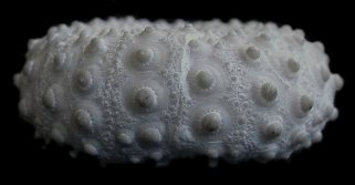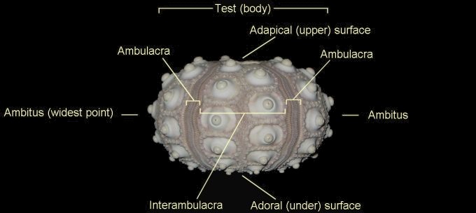 1). Lateral (side) view of a complete recent cidaroid test (body), lacking its original compliment of spines (x3). The test is divided into five interambulacral areas by five vertical ambulacral columns (BMNH guide).