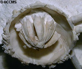 3). Adapical view of a partially-decayed recent cidaroid (x5). The primary spines are mounted on the primary tubercles, and the scrobicular spines are mounted on the scrobicular tubercles. The primary spines form an effective defense against larger predators, with their attachment to the test protected by the scrobicular spines. They also aid in locomotion. Microscopic mounted jaws (pedicellariae) defend the surface of the test against smaller invaders and clear away debris.