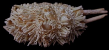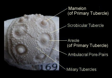 2). (A) Lateral view of an isolated interambulacral segment of Tylocidaris clavigera (x4, adoral end up); cidaroid tests typically disarticulate along the centre of the ambulacral column to leave such segments. The interambulacra are composed of two columns of interlocking pentagonal plates. A primary tubercle is situated at the centre of each interambulacral plate, enclosed within a ring of scrobicular tubercles and an expanse of miliary tubercles. Primary tubercles are comprised of a raised, ball-like mamelon surrounded by a crater-like areole. Different forms of spine are mounted on the various tubecles. The ambulacral pore-pairs act as openings for the tissues of the tube feet; tentacle like projections with a suction-tip, used for clinging and locomotion. (B) Adoral view of a live regular echinoid with it's full compliment of primary spines; from the pages of Discovering Fossils.