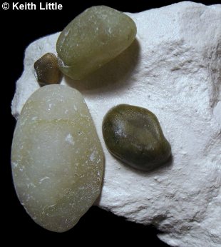 6). An association of likely gastroliths, Seaford Chalk, Kingsgate Bay, Kent, in the collection of Keith Little; (A) Overview of association - only the specimen middle right is still embedded in the matrix (x2.0); (B) Detail of the gastrolith embedded in the matrix (x4.5). Images © 2010 Keith Little, by kind permission.