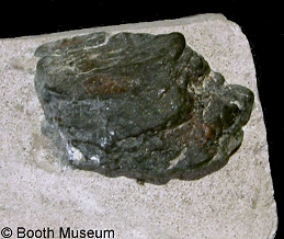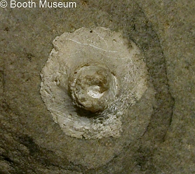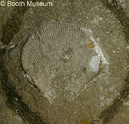 5). Fossils encrusting the boulder figured above; (A) Spondylus latus, bivalve, x2.5; (B) crinoid / coral? holdfast, x3.0.