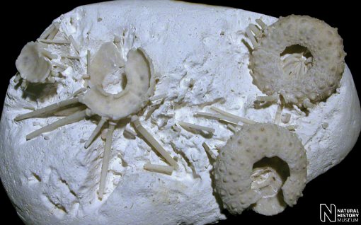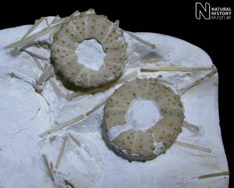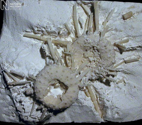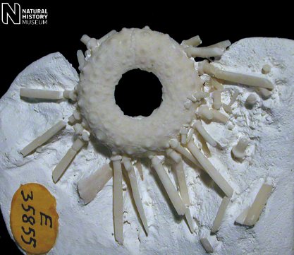 11). An association of tests and primary spines (x2.2, White Chalk, Kent, BMNH (British Museum (Natural History) London) 34086. Image © 2008 The Natural History Museum, by kind permission.
