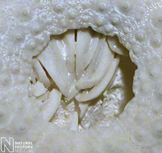 3). (A) Adoral view of an individual preserved with articulated spines a semi articulated lantern (x4.0, Chalk, BMNH (British Museum (Natural History) London) E1931); (B) Detail of peristome and lantern (x8.0). Images © 2008 The Natural History Museum, by kind permission.