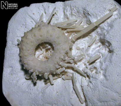 8). An exceptional association of tests preserved with articulated spines and a lantern (x2.0, Chalk, BMNH (British Museum (Natural History) London) E1931). Image © 2008 The Natural History Museum, by kind permission.