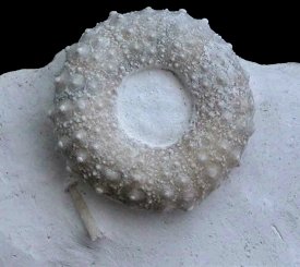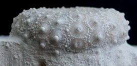 Moderately common regular echinoid from the Late Coniacian to Early Campanian of the White Chalk. Very similar to Gautheria radiata, though they only co-occur in the Seaford Chalk Formation where G. radiata is very rare. The key difference is the primary tubercles, which radically decrease in size above the ambitus for G. radiata, but not for G. spatulifera (compare). Gautheria spatulifera differs from Phymosoma koenigii by its relatively small primary tubercles (compare) and invaginated (concave / depressed) peristome (compare). Primary spines are elongate, fragile, with a spatula-like tip.