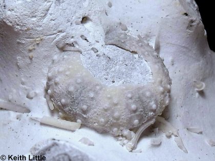 12). Lateral & adapical surfaces of test with associated spine and lantern elements, embedded in flint (Seaford Chalk, North Foreland, Kent, in the collection of Keith Little); (A) x4.7; (B) x5.0. Images © 2010 Keith Little, by kind permission.