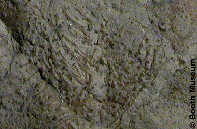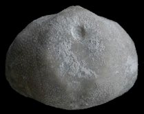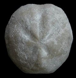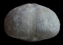 2). Details of the above specimen (x1.5). (A) Posterior (rear) view. The central opening is the periproct. (B) Lateral (side) view, anterior end to the right. (C) Anterior (front) view. The opening bottom centre is the peristome.