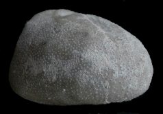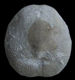 1). Complete and uncompacted test (x2, Grey Chalk, near Cow Gap, Eastbourne, Randell Collection, RR1297). (A) View of the apical (upper) surface, anterior (front) end at the top of the image. (B) View of the oral (under) surface. The opening towards the anterior (bottom of the image) is the peristome.