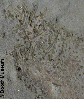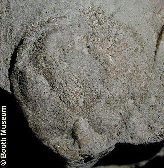 3). Compacted test, which unusually retains a compliment of spines (Grey Chalk, Southerham Grey Pit, Lewes, Ross Collection, Booth Museum, by kind permission of John Cooper; (A) General view of the specimen (x2.7); (B) Detail of spines on the anterior margin (x8.2).