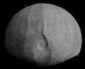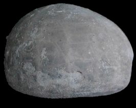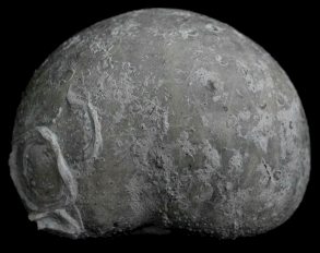 3). Holaster trecensis (x1.5, Grey Chalk, near Cow Gap, Eastbourne). Lateral (side) view, anterior (front) to the left.
