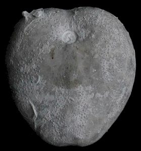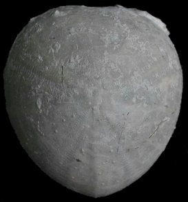 1). Holaster trecensis (x2, Grey Chalk, near Cow Gap, Eastbourne, Randell Collection, RR1328). (A) View of the apical (upper) surface. (B) View of the oral (under) surface. The opening towards the anterior (top of the image) is the peristome.