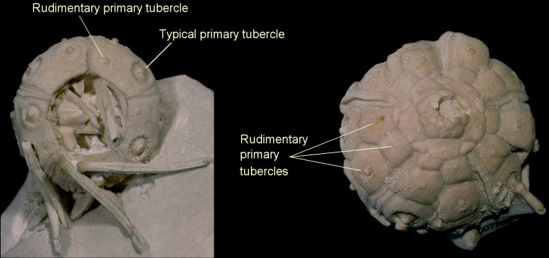 1). Within the genus Phalacrocidaris, adult tests of Phalacrocidaris serrifera (left) are similar to small tests of the closely related Phalacrocidaris merceyi (right). However, the two species are arbritarily distinguished by the number of rudimentary (reduced / non-functional?) primary tubercles situated on the upper (apical) surface of each interambulacral segment. Whereas P. serrifera has only one, tests with more than one can be assigned to P. merceyi.
