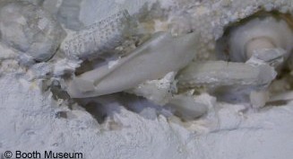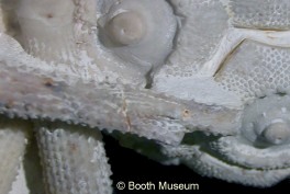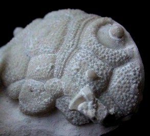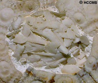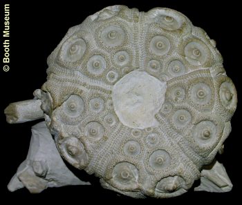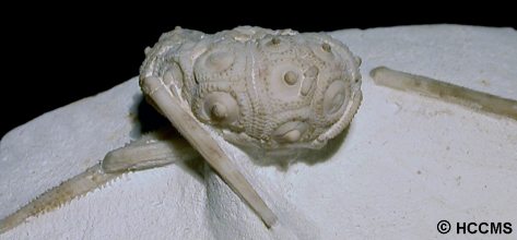 8). Temnocidaris sceptrifera sceptrifera - Lateral view (upside-down) of a small (juvenile?) individual with some spines (x2.6, White Chalk, HCCMS (Hampshire County Council Museum's Service) collection, stored at Gosport Museum, G.1983.393, by kind permission of Dave Kemp, HCCMS).