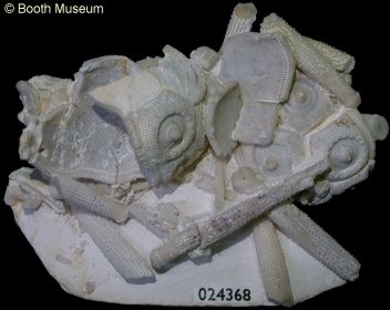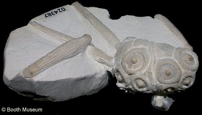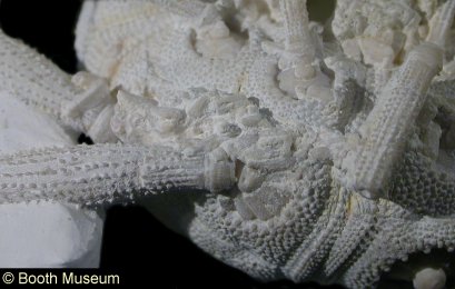 1). Temnocidaris sceptrifera sceptrifera - Adoral view of a spectacular new specimen, retaining a largely articulated complement of primary spines and scrobicular spines and with the tip of the articulated lantern protruding through the peristomal plating and mesh of adoral-most spines which appear to have closed over the mouth opening (x2.0, Seaford Chalk, 0.3m above Rowe's Echinoid Band, Thanet, Kent, in the collection of Keith Little). Image © 2012 Keith Little, by kind permission.