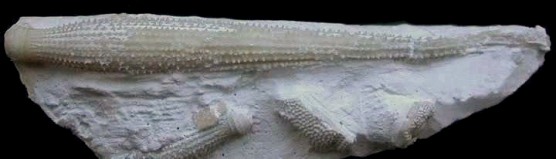 2). Temnocidaris sceptrifera sceptrifera - Typical primary spine from the ambital region of the testl with a thick swollen proximal portion, and a long and tapering distal portion with a slightly flared tip. Dense ornament of small thorns curved slightly towards the distal end and arranged in closely spaced longitudinal rows (x3, Seven Sisters, Seaford Chalk Formation, Randell Collection, RR1185).