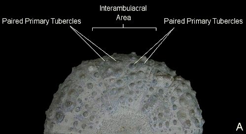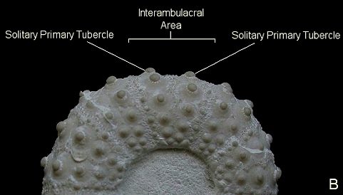 1). (A) Adoral view of Tetragramma variolare. Each interambulacral plate has 2 or more primary tubercles. (B) Adoral view of Phymosoma koenigii. In contrast with Tetragramma variolare, there is only one primary tubercle per interambulacral plate.