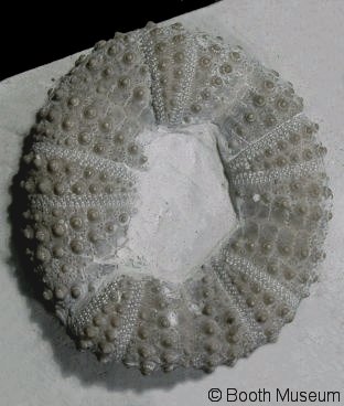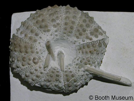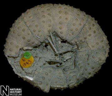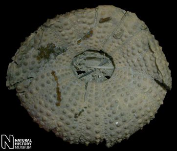 4). Adoral view of an exceptional specimen with a large compliment of articulated primary spines (x1.3, Grey Chalk, Folkestone Kent, BMNH (British Museum (Natural History) London) E1086. Image © 2008 The Natural History Museum, by kind permission.