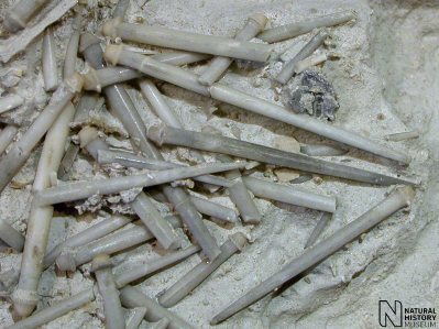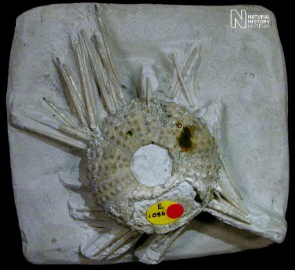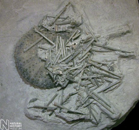 2). Adoral view of a complete test with a large compliment of primary spines (x1.2, Grey Chalk, Dover Kent, BMNH (British Museum (Natural History) London) E1085. Image © 2008 The Natural History Museum, by kind permission.